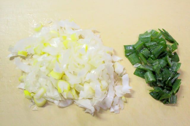 1. 長ねぎの白い部分と青い部分を、粗みじん切りにします。