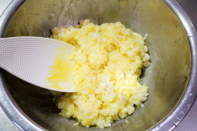 2. 粗熱を取ったご飯に、卵1個を割り入れます。ご飯を切るようにして、ご飯全体に卵液をまとわせます。