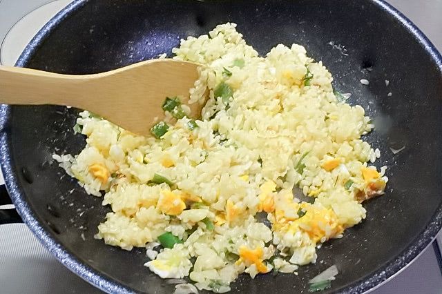 ご飯全体がパラパラになるなら、フライパンを振りながらでも、ヘラを両手に持って鉄板焼き風に炒めても構わないとのこと。炒めやすい方法で、ご飯を潰さずに炒めてくださいね。