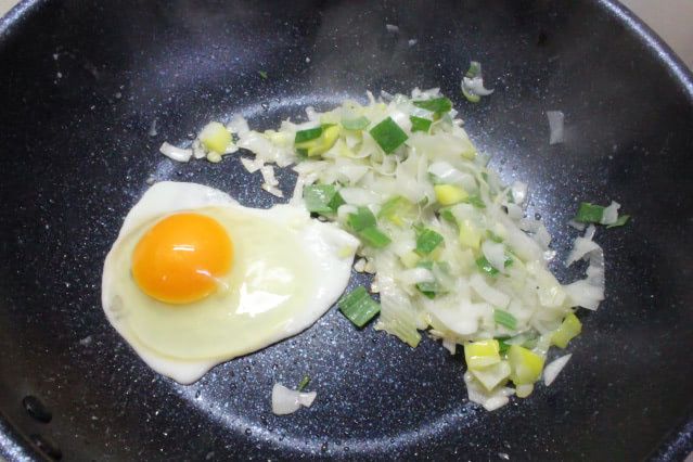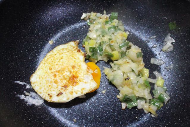 1分ほど長ねぎを炒めて香りを引き出し、卵を割り入れて目玉焼きを焼きます。4分ほど焼いて目玉焼きの底を少し確認すると、茶色い焼き色が付いていました。