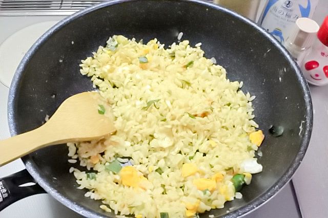 今回は、ご飯を卵でコーティングしているので、卵がパサパサとしない温度帯の弱火に。弱火で混ぜながら3分ほどかけて炒めると、ご飯も具もパラパラになりました♪