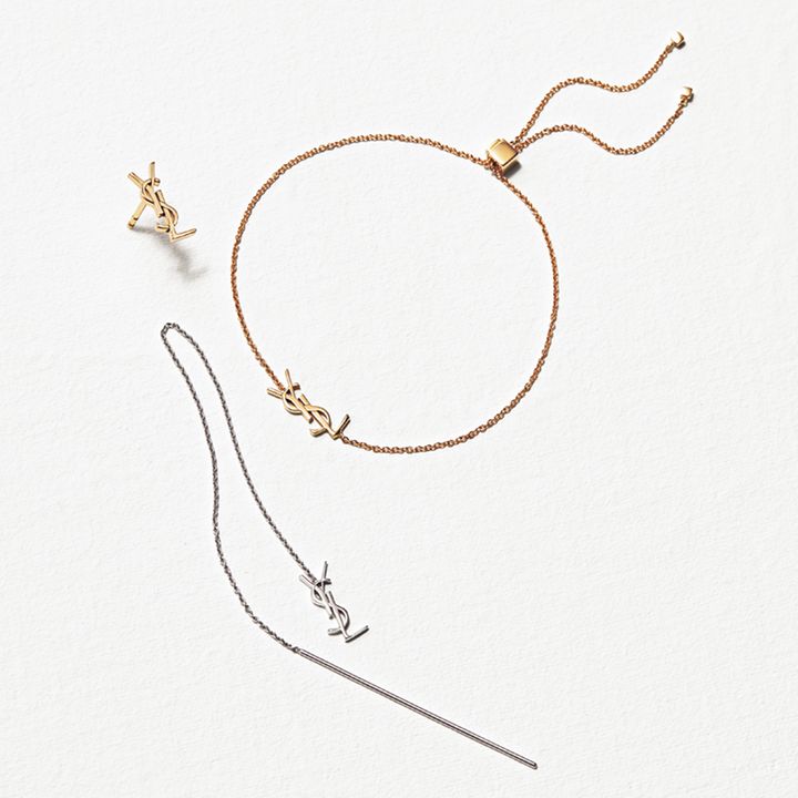 ファインジュエリーデビューにもオススメなのはサンローラン。ブレスレット〈カサンドラ ブレスレット〉[18KYG]¥170,500シングルスタッドピアス〈カサンドラ スタッド イヤリング〉[18KYG]¥119,900シングルロングピアス〈カサンドラ ドロップイヤリング〉[18KGG]¥170,500(すべてサンローラン バイ アンソニー・ヴァカレロ/サンローラン クライアントサービス)