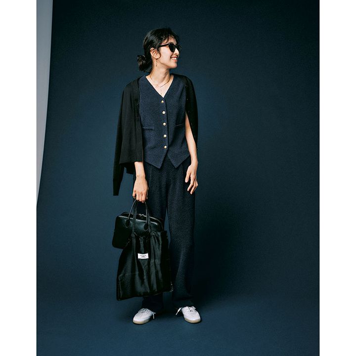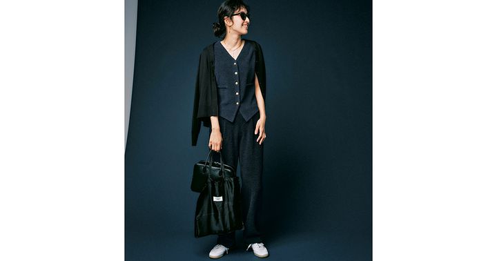 子どもの学校行事などで何かと重宝する黒紺スタイルは、トレンドを少しずつ拾うことが地味見えしないコツ。そこで、高橋志津奈さんが“今年学校に使えるネイビーと黒”をリストアップ。今回は、きちんと感はキープしつつ、程よく肩の力を抜いたムードのジレ&パンツをご紹介します。