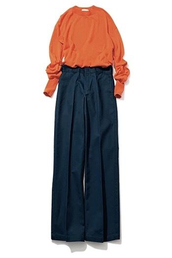 「リジッドデニム感覚で」チノパンを。オレンジは今年のキーカラーの1つ。王道のデニムを合わせるのが簡単ですが、少しだけひねりを効かせて、デニムのようなネイビーパンツを選びました。引き締めつつカジュアルさも残せるので重宝」(スタイリスト・渡邉恵子さん)