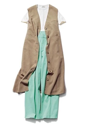 「たとえば旬のロングジレをバランサーとして採用。丈の長い服でボトムを隠して色の面積を狭めれば、カラーパンツも着やすくなります。まっすぐなシルエット作りにもひと役買ってくれる、今シーズンも豊富なロングジレを活用すればシンプルコーディネートも今っぽく」(スタイリスト・船戸唯さん)