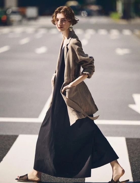 「まじめなジャケット+ゆるいワンピース」組み合わせの成功例