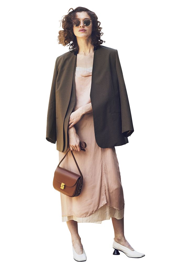 洗いをかけたようなマットなツヤのドレスに、相反するスーツ地のジャケットを雑に肩がけ。Vネックの鋭さとカーキの重厚感で、力みのないきちんと感を加算。前身ごろ部分はレイヤード風のデザインになっていて、ボタンレスでも心もとなさはなし。