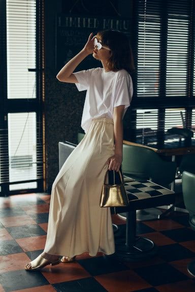 ツヤ感のあるボトムは乾いた質感のトップスと好相性。柔らかく揺れる、とろみがかった素材感を合わせれば、カジュアルな白Tシャツもドレッシーな表情に。そんな柔らかなサテンスカートは、色も淡いベージュなど、シンプルでも女っぽさを十分に語れるニュアンスカラーがおすすめ。