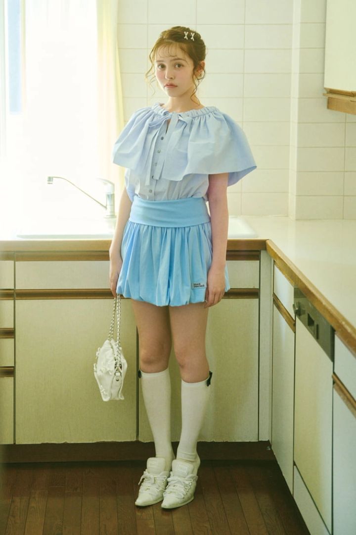 バルーンブラウス 19,800円/HONEY MI HONEY ボリュームミニスカート 13,200円/Mardi Mercredi(MARDI MERCREDI JAPAN)ヘアピン(2個セット)990円/アネモネ(サンポークリエイト)ソックス 869円/チュチュアンナ バッグ 13,750円/ダイアナ(ダイアナ 銀座本店)スニーカーミュール 22,000円/YELLO