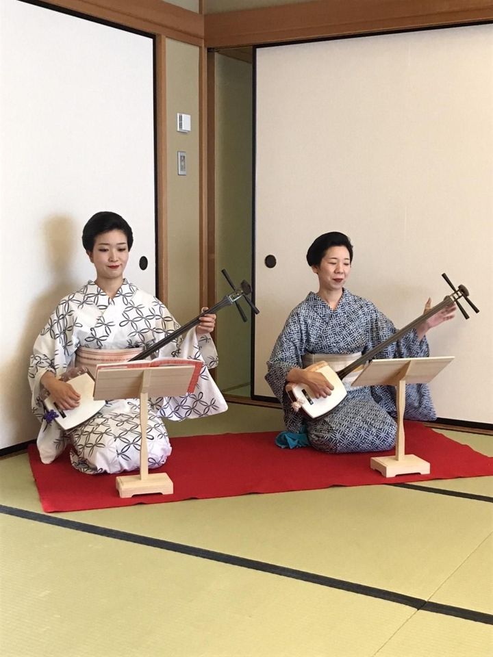 三味線の発表会にて。向かって左がこと代、隣は地方の三子姐さんです。