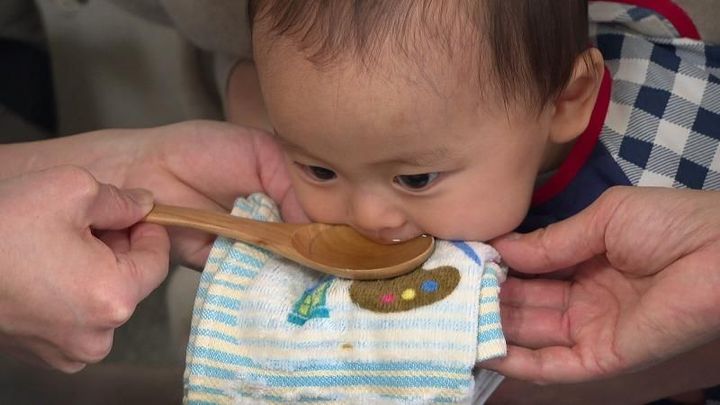 大人たちが、飲んだり食べたりする赤ちゃんの「口」の動きに注目しています。