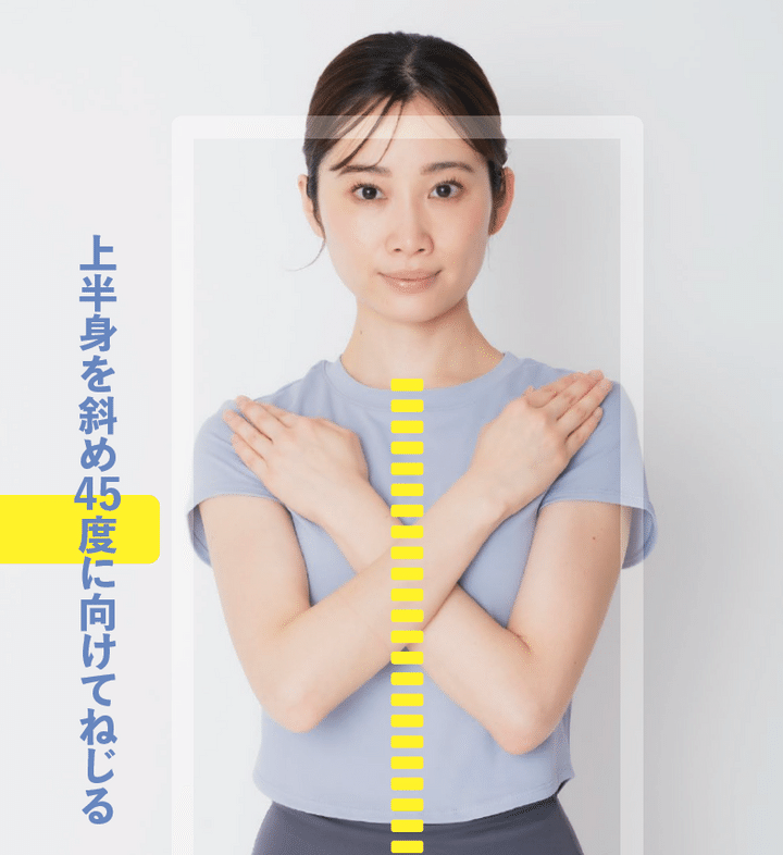 背中の筋肉が縮み、反対側のわき腹が伸びた感覚を覚えるまでしっかりねじって。