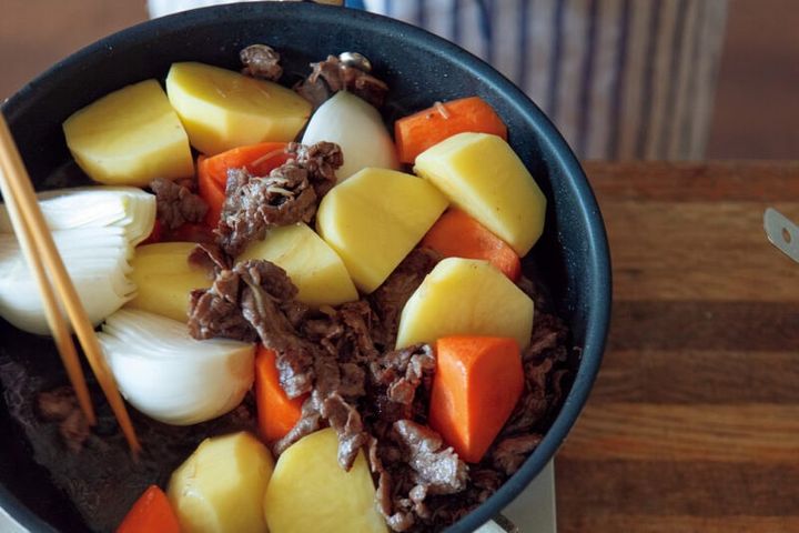 「仕上がったとき、すべての材料の火の通りが同じになるよう考えて、それぞれの具材の大きさを違えて切るんです。肉じゃがだったら、じゃがいもは、やや大きめのほうが見栄えもよく、じゃがいものおいしさも引き立ちます。切って水にさらしているから、煮崩れもしにくくなります。そして、じゃがいもを基準にし、他の具材の大きさを調整します」