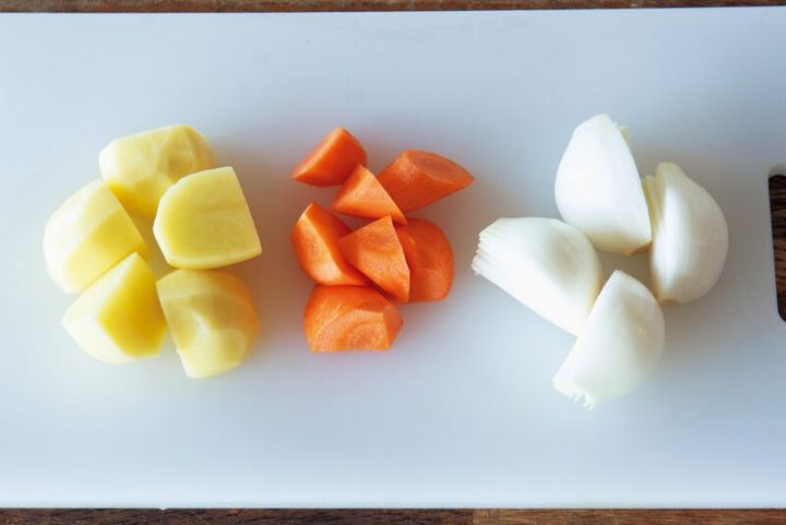 いちばん固いにんじんは小さく、火が入りやすい玉ねぎは大きめに。「にんじん1/2本など中