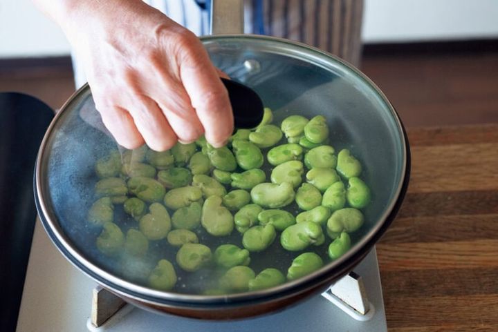 そら豆はさやから出して薄皮をむく。
