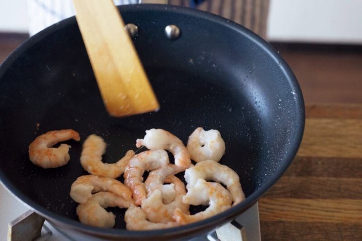 フライパンをキッチンペーパーでさっとふき、油を足してむきえびを入れて中火で炒める。