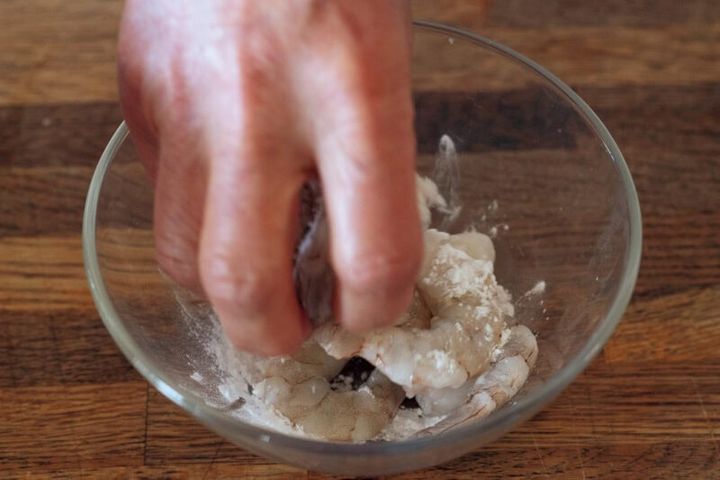 むきえびに片栗粉をまぶし入れて軽くもみ込む。