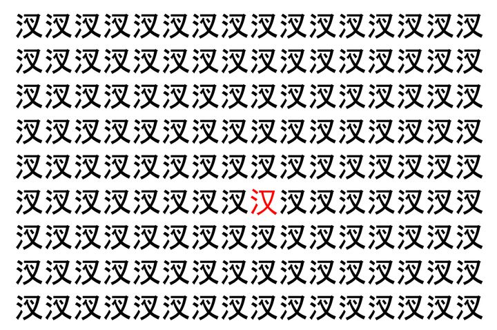 画像の中には、「汊」という漢字が縦に9行、横に16個並んでいます。 全部で144個となりますが・・・、そのうち1つは「異なる漢字」となってますよ!!