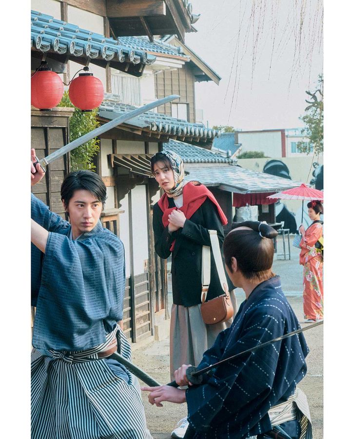 「実は明日、映画村で撮影なんだ」って聞いた時はびっくりしたけど、なんか、本格的〜。侍姿の彼にキュン。何度も見た気がする彼の剣さばき…。彼って、剣道部だったんだっけ? いや、彼の剣さばきは部活のレベルをとうに超えている。あまりに本格的だから彼が怪我をしないか心配で心配で。なんかこういうドキドキ、前もあった気がする。彼を待っていた時…、いやそんなことなかったよね。じゃあこの鼓動の速さは何からくるものなんだろう。バッグ¥79,200(ロンシャン/ロンシャン・ジャパン)スニーカー¥22,000(ニューバランス/ニューバランスジャパンお客様相談室)スカーフ¥22,000(マニプリ)[メンズほか]映画村協力衣装