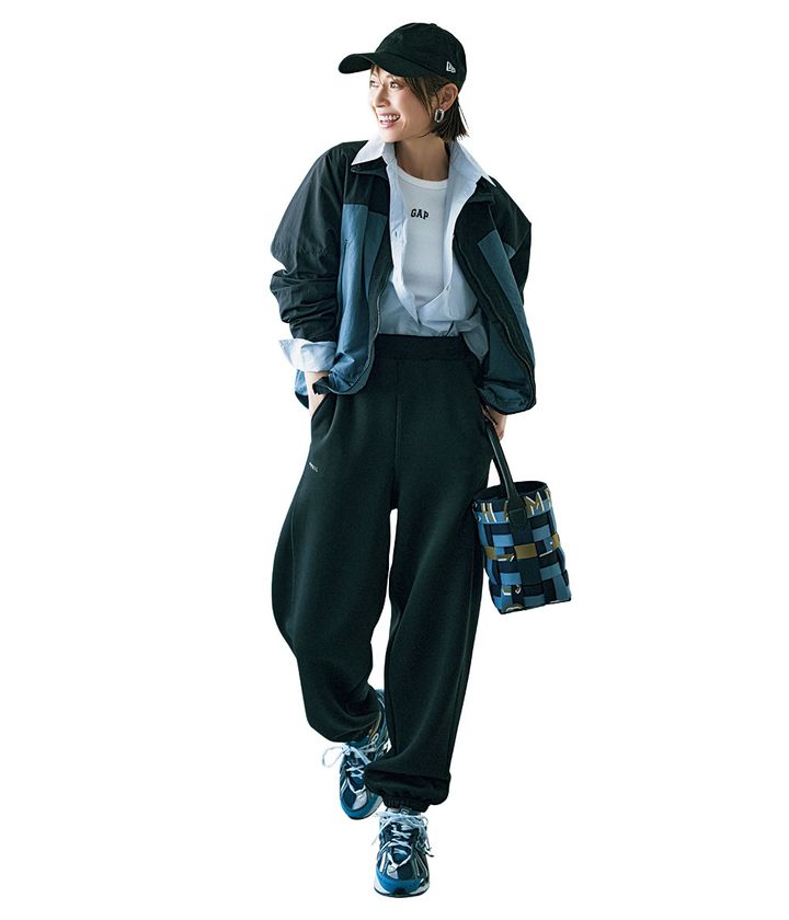 パンツ¥25,300(LE PHIL/LE PHIL NEWoMan 新宿店) ブルゾン¥27,500(マーモット/エストネーション) シャツ¥22,000(ザ ポーズ/ウィム ガゼット 玉川髙島屋S・C店) タンクトップ¥3,490(ギャップ) バッグ¥91,300(ロンシャン/ロンシャン・ジャパン) スニーカー¥19,800(ニューバランス/ニューバランス ジャパンお客様相談室) キャップ¥4,620(ニューエラ) ピアス¥11,000(ワンエーアールバイウノアエレ/ウノアエレ ジャパン)