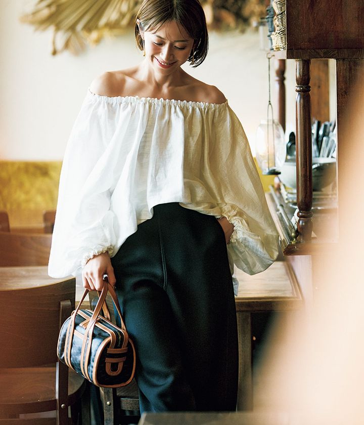 パンツ¥25,300(LE PHIL/LE PHIL NEWoMan 新宿店) ブラウス¥33,000(ドゥーズィエム クラス/ドゥーズィエム クラス 青山店) バッグ¥166,100(ピエール アルディ/ピエール アルディ 東京) ピアス¥16,060(エムシー・スタジオ/ZUTTOHOLIC)
