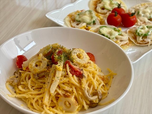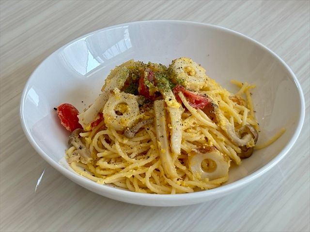 カルボナーラのクリーミーさとビタミンちくわの甘みが絶妙にマッチし、いつものカルボナーラとは一味違ったおいしさを楽しめます。