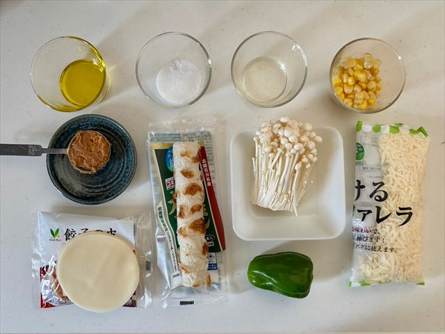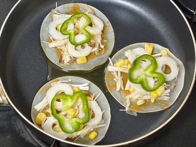 3. フライパンにオリーブオイル(大さじ1)を入れて温めたら、火を止め、餃子の皮をおき、エノキタケ、コーン、ちくわ、ピーマンかパプリカをのせる。