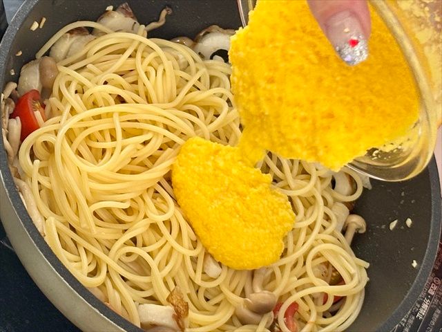 5. 事前に混ぜ合わせた★カルボナーラ液を、火を止めた [4.] に加えて全体に絡めます。