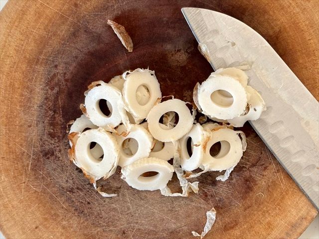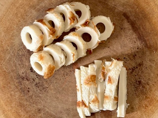 2. ビタミンちくわは1本は輪切り、1本は長さを3等分して細切りにします。