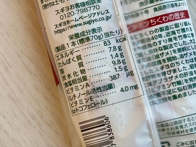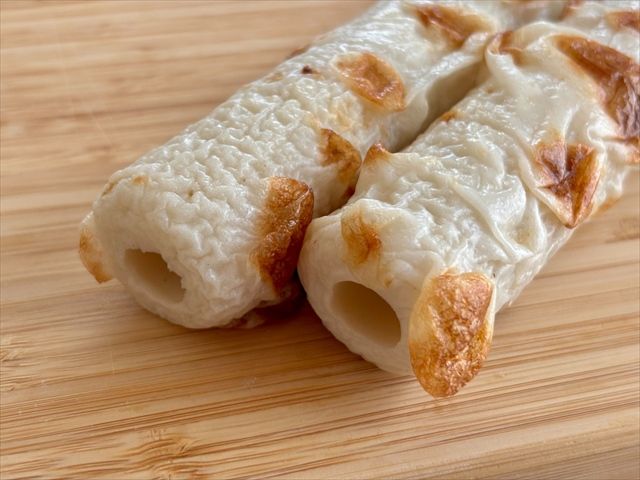 ビタミンちくわは長さも太さも一回り大きく、表面の焼き目もやや濃いめ。ひと目見ただけで、肉厚で食べ応えがありそうな印象を受けます。