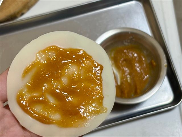 2. 餃子の皮に、★みそソースを小さじ1/2くらいを目安に塗る。