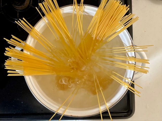 1. たっぷりのお湯でスパゲッティを茹でておきます。