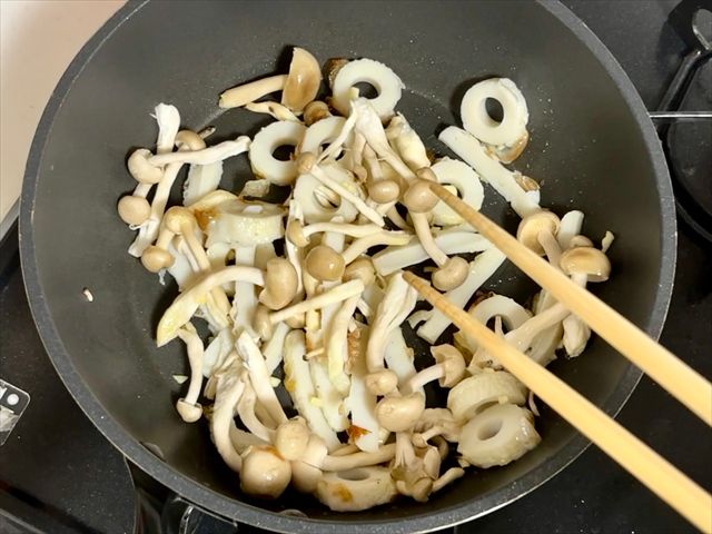 3. フライパンにオリーブオイルを熱し、にんにく、ブナシメジ、ちくわを炒めます。