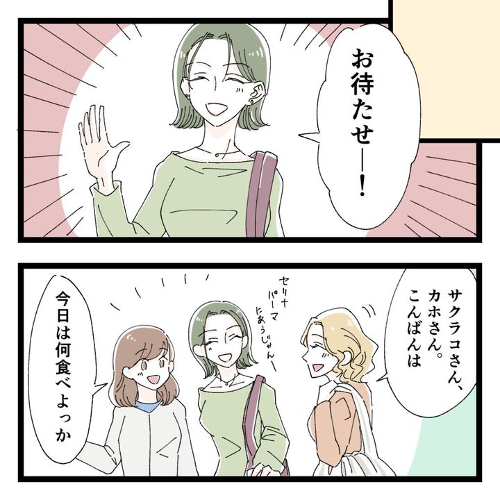 「お待たせー!」笑顔で駆け寄るサクラコ。「サクラコさん、カホさん、こんばんは」笑顔でやって来たセリナ。3人集まると、「今日は何食べよっか」とご飯を食べに行くことに。