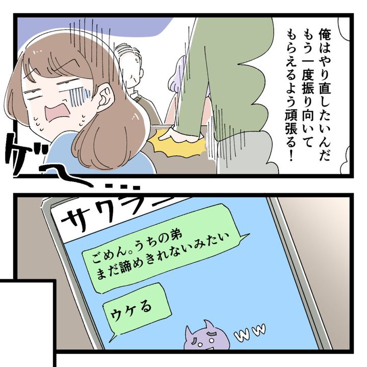 「俺はやり直したいんだ。もう一度振り向いてもらえるよう頑張る!」と全く懲りていない様子に愕然。すかさずサクラコに、「ごめん。うちの弟まだ諦めきれないみたい」とメッセージを送ると、「ウケる」と即返信がありました。