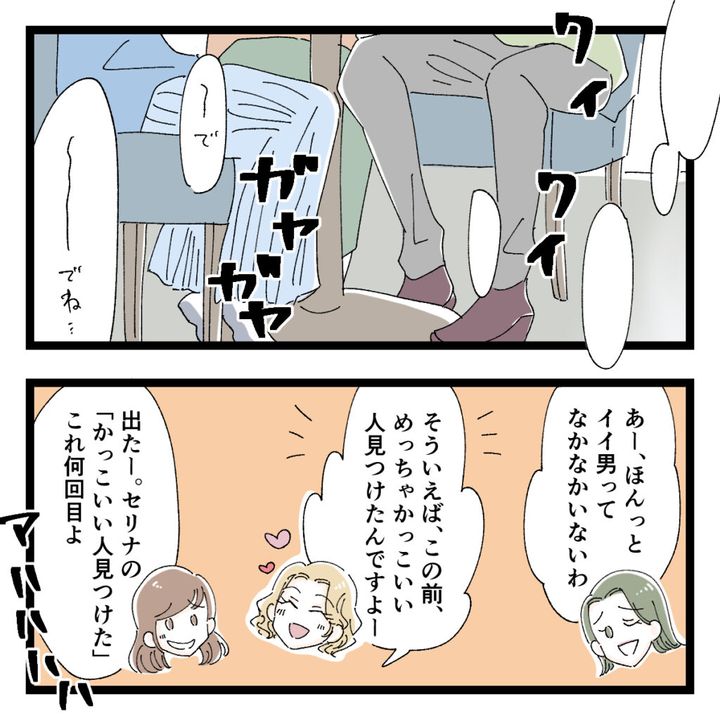 賑やかな店内で、「あー、ほんっとイイ男ってなかなかいないわ」サクラコがそう言うと、「そういえば、この前、めっちゃかっこいい人見つけたんですよー」笑顔で話すセリナ。すかさず、「出たー。セリナの『かっこいい人見つけた』これ何回目よ」そう言って大声で笑い合う私たち。いつしか仲良く女子会をする仲になっていました。