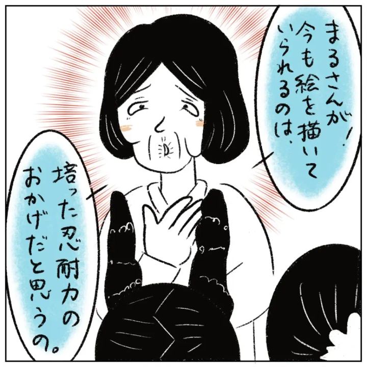 すると、「まるさんが!今も絵を描いていられるのは、培った忍耐力のおかげだと思うの」と押しつけがましく言う性根先生。