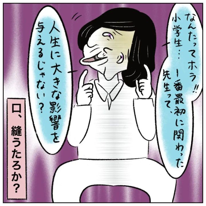 「なんたってホラ!!小学生・・1番最初に関わった先生って、人生に大きな影響を与えるじゃない?」とふざけながら言う性根先生を見て、「口、縫うたろか?」と心の中で思うまるさんが、