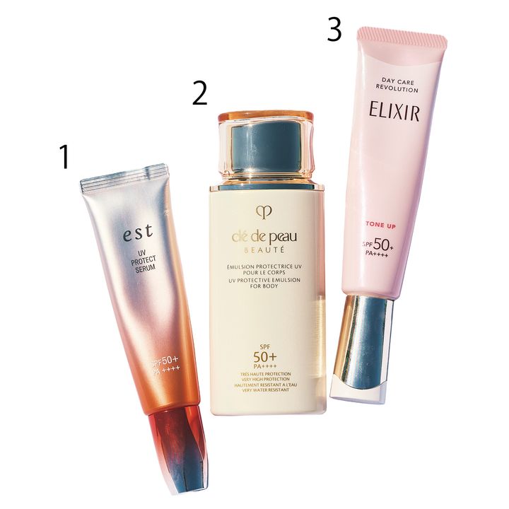 1.【目元用】エイジングケアできるエストUVプロテクトセラムは目元に塗ってUV対策しながらハリを与えます。2.【体用】ボディはクレポのエマルションUVコールn。ハリのあるもちもち肌が続きます。3.【顔用】顔色を明るくするエリクシールのデーケアレボリューショントーンアップSP+aa。頰、おでこ、顎、鼻に少量塗ると顔に立体感が出て、小顔効果も狙えます。