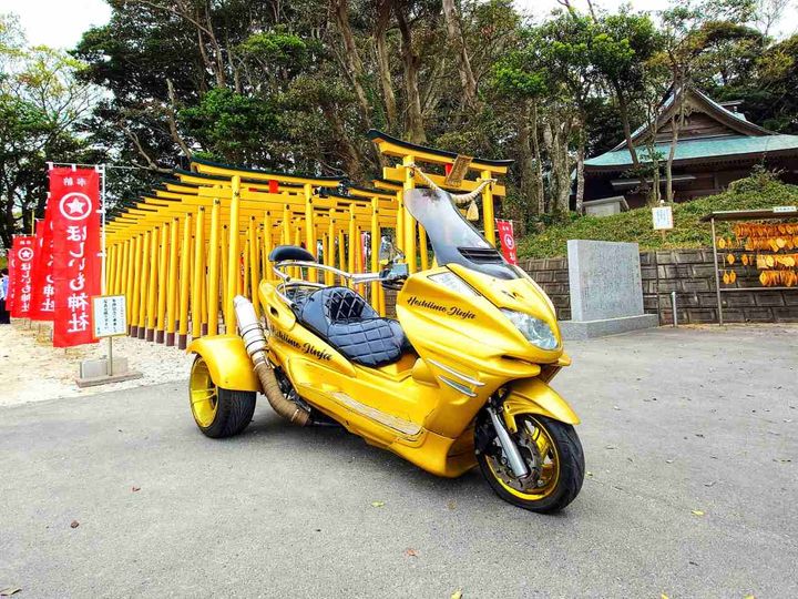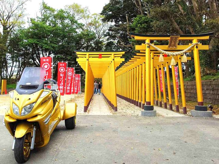 ほしいも神社でまず目を引くのは、何と言っても金色の鳥居とバイク! 早朝には鳥居の向こう側から太陽が昇ることから、陽光によって鳥居が一層パワフルに輝くそうです。