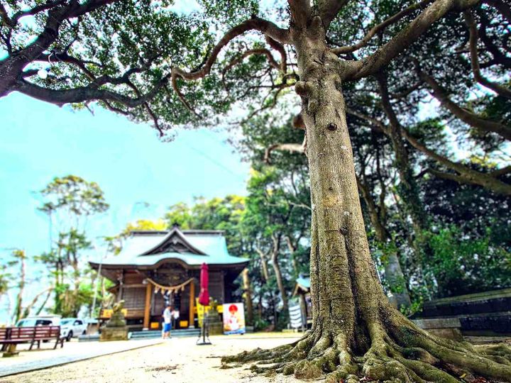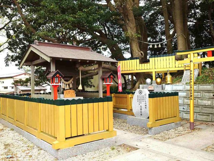 鳥居の先には、干し芋の創始者・小池吉兵衛など5名を干し芋の神様としてお祀りし、「縁結び・夫婦円満・子孫繁栄・長寿」など御利益のある御神木が鎮座。境内は至る所がキラキラ。海からの爽やかな風も相まって気持ちがパーッと明るくなります!