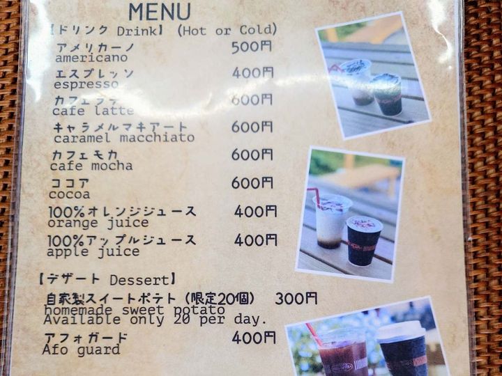 アメリカーノ、カフェラテ、エスプレッソ、キャラメルマキアート(税込600円)、カフェモカ(税込600円)、ココア(税込600円)、オレンジ・アップルジュース(税込400円〜)。