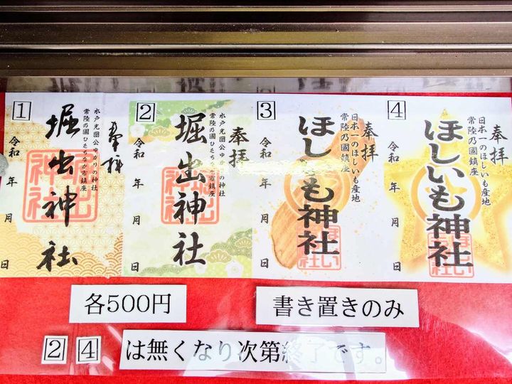 「堀出神社」と「ほしいも神社」の御朱印(初穂料500円)は、数量限定で書き置きのみ。「御朱印帳にのりで貼り付ける時によれてしまう」という参拝者の声に応えて、なんと裏面がシールになっています。御朱印帳に直接きれいに貼れるという大発明!