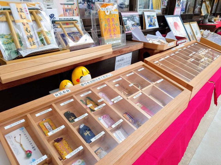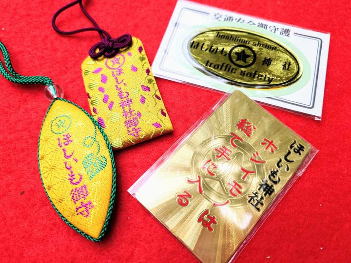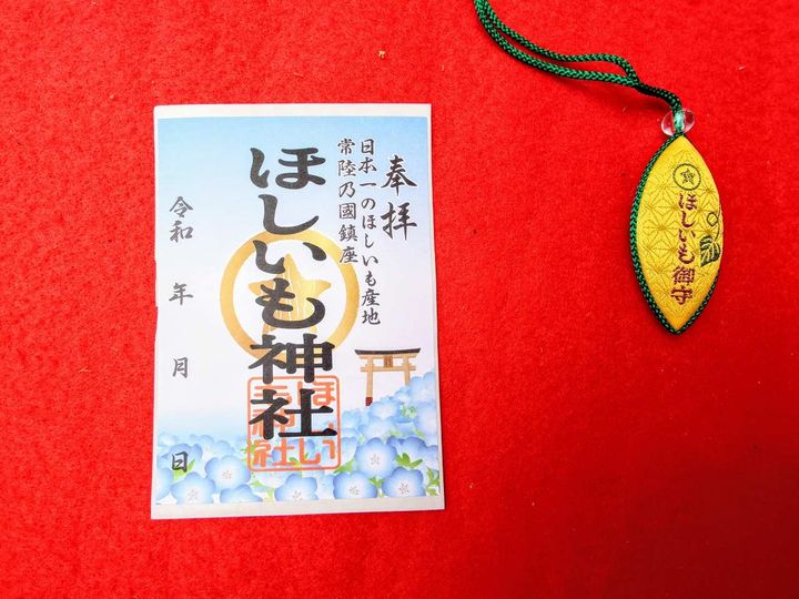 おいもの形や色をした可愛らしいデザイン、ステッカー・カードタイプの御守り、ほしいも神社の神札、黄金色の長寿箸、交通安全・金運・厄除けの御守り、ペット御守りなど種類豊富(初穂料500円〜)。