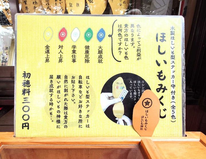 木製ほしいも型ステッカー守付き「ほしいもみくじ」(初穂料300円)。「金(金運上昇)、赤(対人上昇)、白(学業仕事)、緑(健康厄除)、青(大願成就)」の全5色。ちなみに、貼ったステッカーが自然と剥がれたら願いが叶うかも……。という謂れが?!