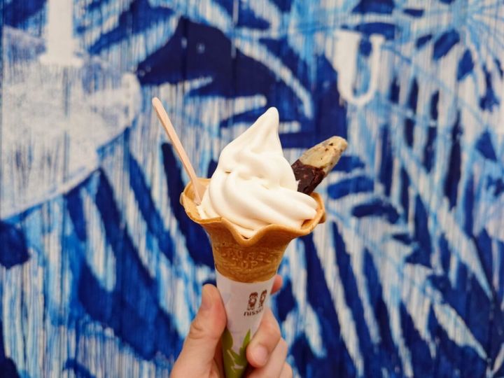 駅から徒歩5分の場所には、茨城県の干し芋の専門店「マルヒ」の直売所があり、干し芋やスイーツを販売しています。特に、平日限定「干し芋ソフトクリーム」(税込400円)は絶品。干し芋ペースト入りのクリーミーなソフトクリームで、チョコをまとった干し芋もトッピングしています。7〜8月の阿字ヶ浦海岸の海の家営業日には「南浜ビーチガーデン」「サーフサイド渚」で限定販売しているご当地スイーツです!