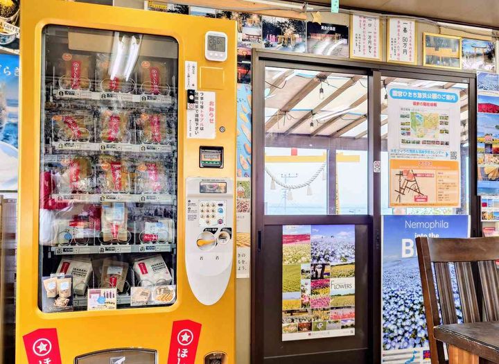 カフェの隣には、干し芋やお芋のお菓子を販売する自動販売機を設置した休憩所もあります。茨城県の観光パンフレットも数多く並べてあるので、散策の参考になる情報をゲット!