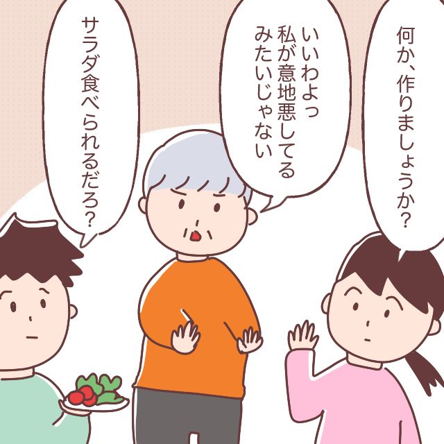 「何か、作りましょうか?」何も食べるものがないと文句を言う義母にたずねると、「いいわよっ、私が意地悪してるみたいじゃない」不機嫌そうに話す義母に、「サラダ食べられるだろ?」夫がサラダを差し出しました。