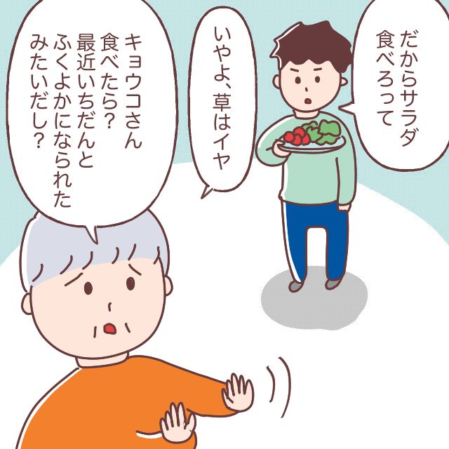 「だからサラダ食べろって」と差し出す夫に、「いやよ、草はイヤ」と頑なな義母。「キョウコさん食べたら?最近いちだんとふくよかになられたみたいだし?」と私への嫌味は忘れません。