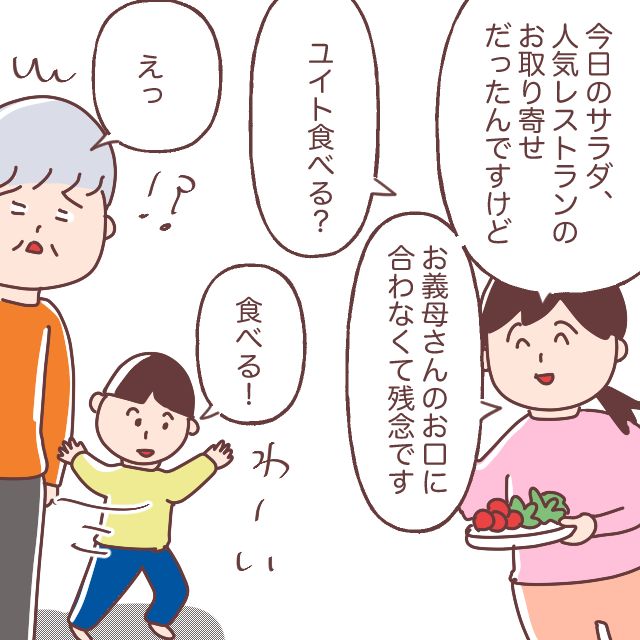 すかさず、「今日のサラダ、人気レストランのお取り寄せだったんですけど、お義母さんのお口に会わなくて残念です」そう言ってから「ユイト食べる?」と聞くと、「わーい!食べる!」とうれしそうなユイト。それを見た義母が突然惜しくなったかのように驚いていました。